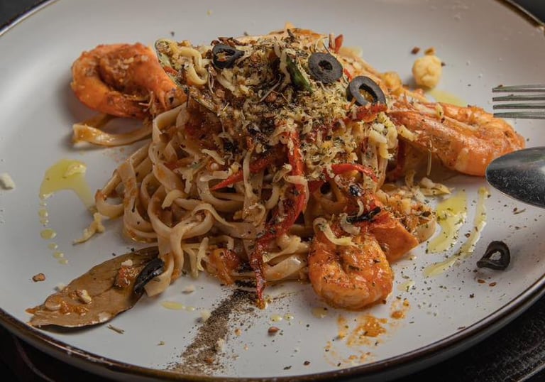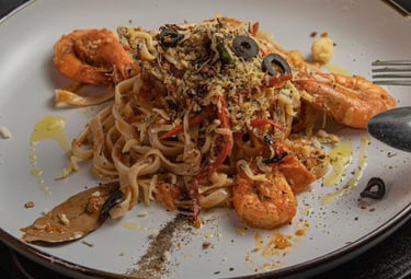 Pasta tossed in our homemade marinara sauce, made from scratch with ripe tomatoes, garlic, and herbs — topped with a generous serving of fresh local seafood. A flavorful favorite.